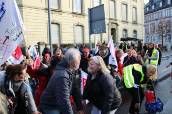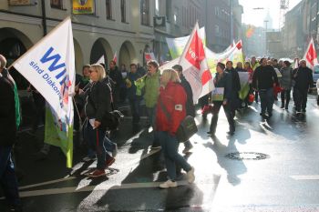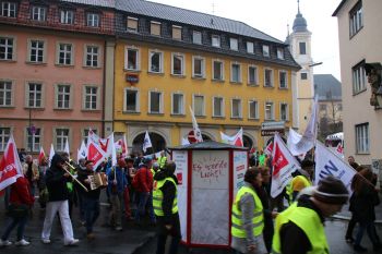 der geplanten MVG-EKD-Novellierung mit den Forderungen der ArbeitnermervertreterInnen auseinanderzusetzen. Unsere Aktion unter der Organisations- leitung von ver.di war ein voller Erfolg! Bereits vor Beginn des Eröffnungsgottesdienstes räumte die Präses der Synode der Evangelischen Kirche, Irmgard Schwaetzer, in einem Exklusiv- interview ein, dass die Arbeitnehmerinte- ressen ernst genommen werden würden und der Entwurf an einigen Stellen noch eine Verbesserung erfährt. So insbesondere bezüglich den im Entwurf vorliegenden Verschlechterungen bei der Mitbestimmung bezüglich Einigungsstellen würde die Kennzahlen nach unten korrigiert. Sie betonte abschließend anerkennend, dass es ein besonderes und wichtiges Zeichen in unserer Demokratie sei, wenn sich so viele Menschen am frühen Sonntagmorgen hier im strömenden Re- gen versammeln. Lautstark sind wir durch Würzburg von der St. Stephanskirche zum Tagungsort der Synode gezogen und haben demonstriert: