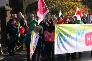 haben sich am frühen Sonntagmorgen bei strömenden Regen vor der St. Stephan-Kirche in Würzburg versammelt, um gegen die geplanten Verschlechterungen des MVG der Evangelischen Kirche Deutschland zu protestieren. Ein Drittel kam allein aus Württemberg! Dafür ein herzliches Dankeschön und kräftigen Applaus all diesen engagierten Kolleginnen und Kollegen!!