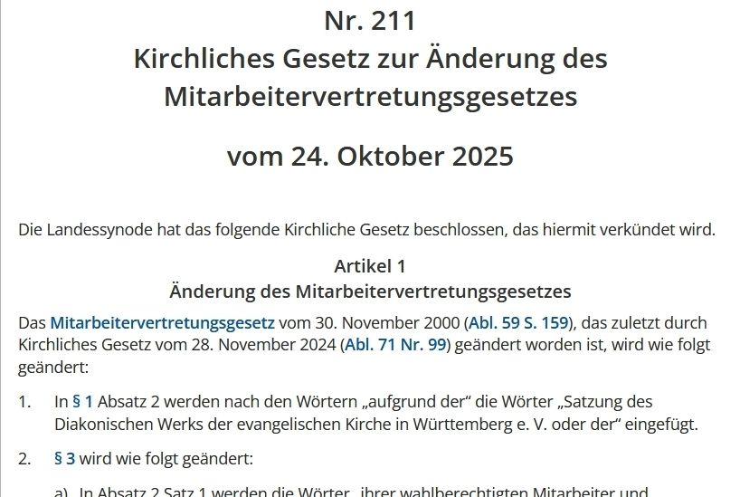 Die Synodalen hatten in ihrer letzte Sitzung der Amtsperiode im Oktober 2025 beschlossen, das MVG.Württemberg in der vom Rechtsausschuss vorgelegten Form WEB PDF zu ändern.