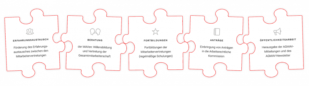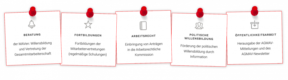 Die Mitarbeiter*innen der Geschäftsstelle unterstützen den AGMAV-Vorstand bei der Planung und Durchführung seiner Aufgaben, insbesondere bei der Erarbeitung von Vorlagen an die Arbeitsrechtliche Kommission sowie bei der Beratung und Information der Mitarbeitervertretungen der Mitgliedseinrichtungen des Diakonischen Werks Württemberg in ihren Aufgaben, Rechten und Pflichten.