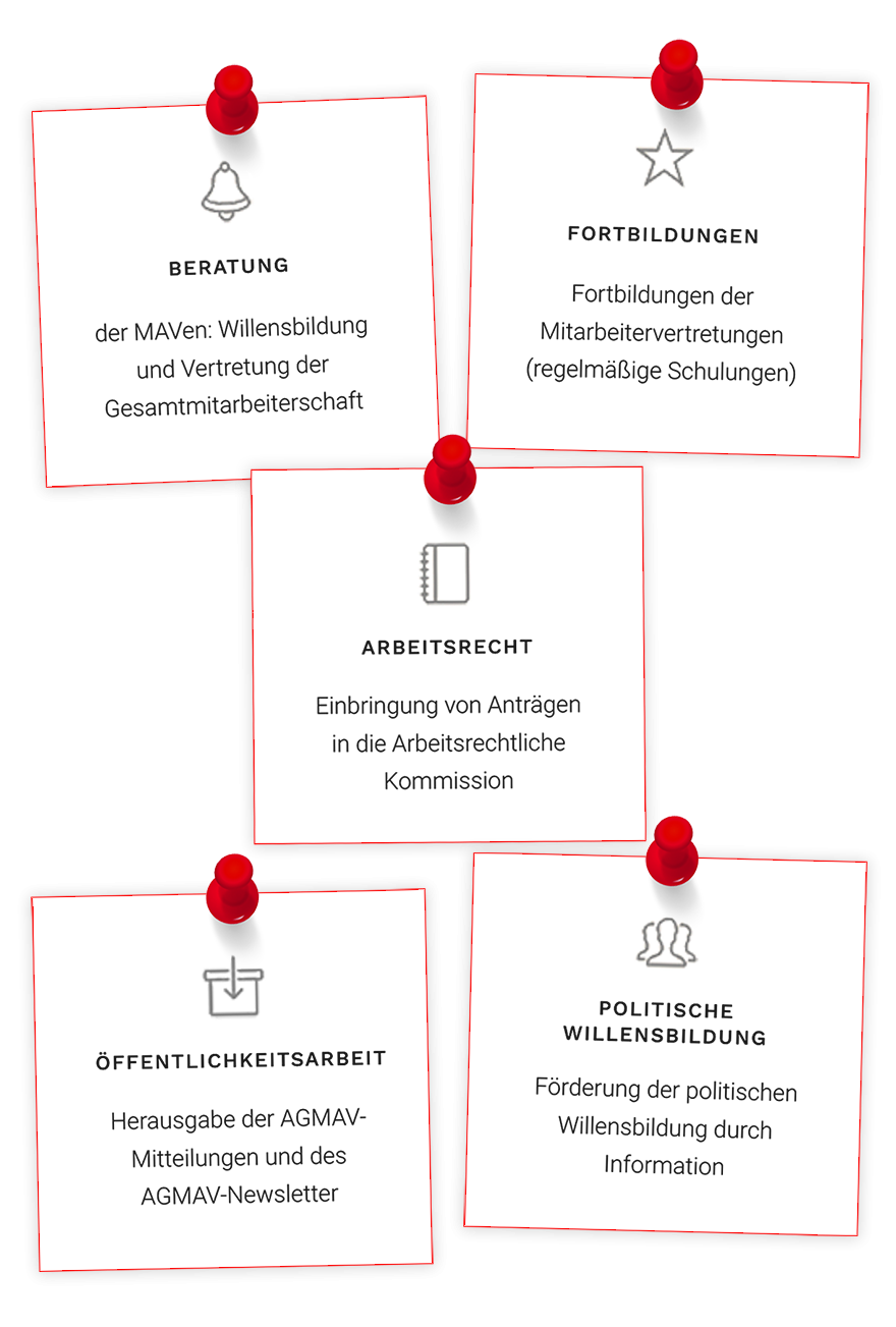 Die Mitarbeiter*innen der Geschäftsstelle unterstützen den AGMAV-Vorstand bei der Planung und Durchführung seiner Aufgaben, insbesondere bei der Erarbeitung von Vorlagen an die Arbeitsrechtliche Kommission sowie bei der Beratung und Information der Mitarbeitervertretungen der Mitgliedseinrichtungen des Diakonischen Werks Württemberg in ihren Aufgaben, Rechten und Pflichten.